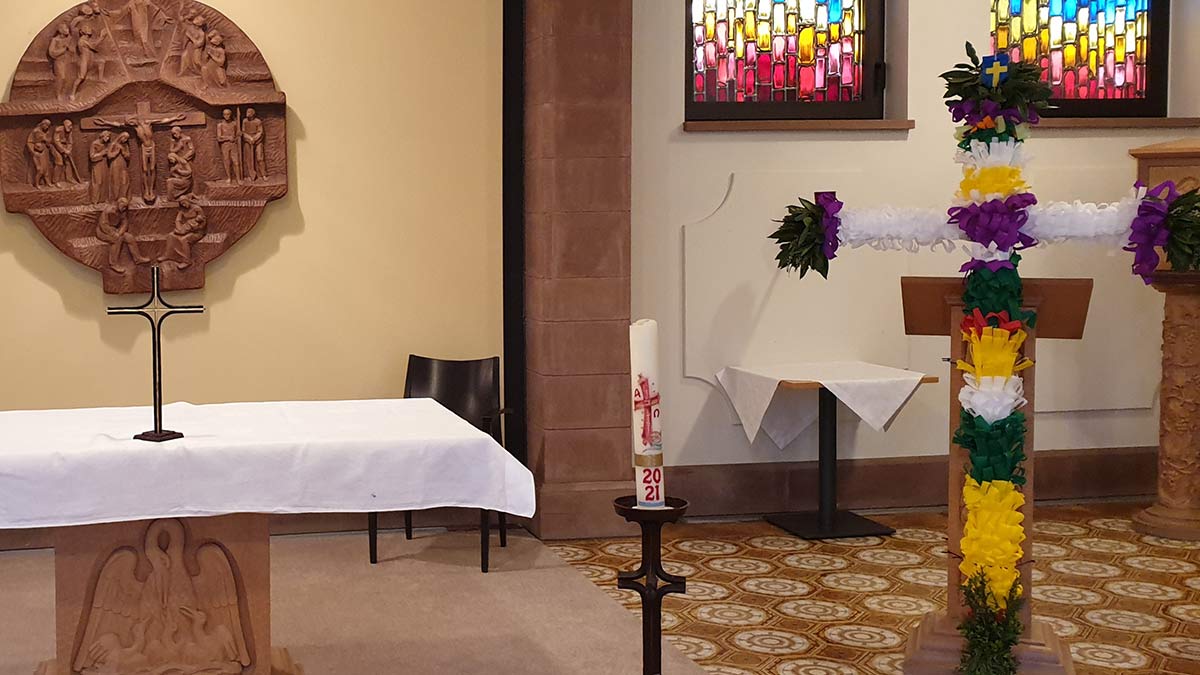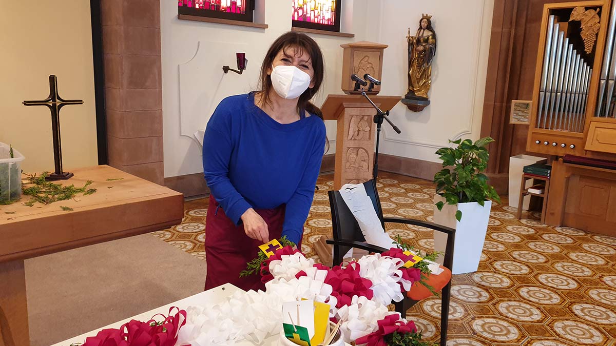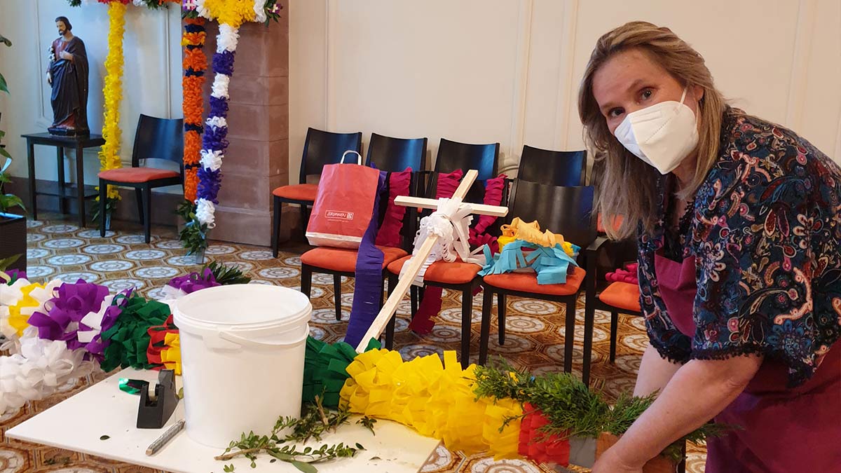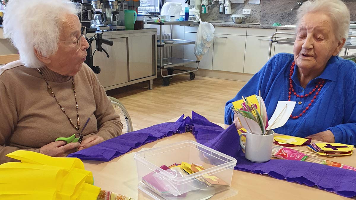 Zu Palmsonntag wurden von den Betreuungskräften Marion Roth und Renata Fritz gemeinsam mit den Bewohner*innen in EndingenPalmen gebastelt. Darunter war auch eine Palme in den Farben der Ukraine. Wie in Mitteleuropa üblich wurden anstatt Palmzweige traditionell heimische Pflanzen wie Weidekätzchen, Ahorn-, Buchen-, Haselnuss-, Birken- oder auch Wacholderzweige benutzt. In manchen Regionen werden sogenannte Palmbuschen oder auch Palmbesen gebunden und mit gefärbten Ostereiern, bunten Papierstreifen oder Fastenbrezeln geschmückt. Die bunten Papierstreifen erkennt man ja auch im „Haus St. Katharina“ wieder.