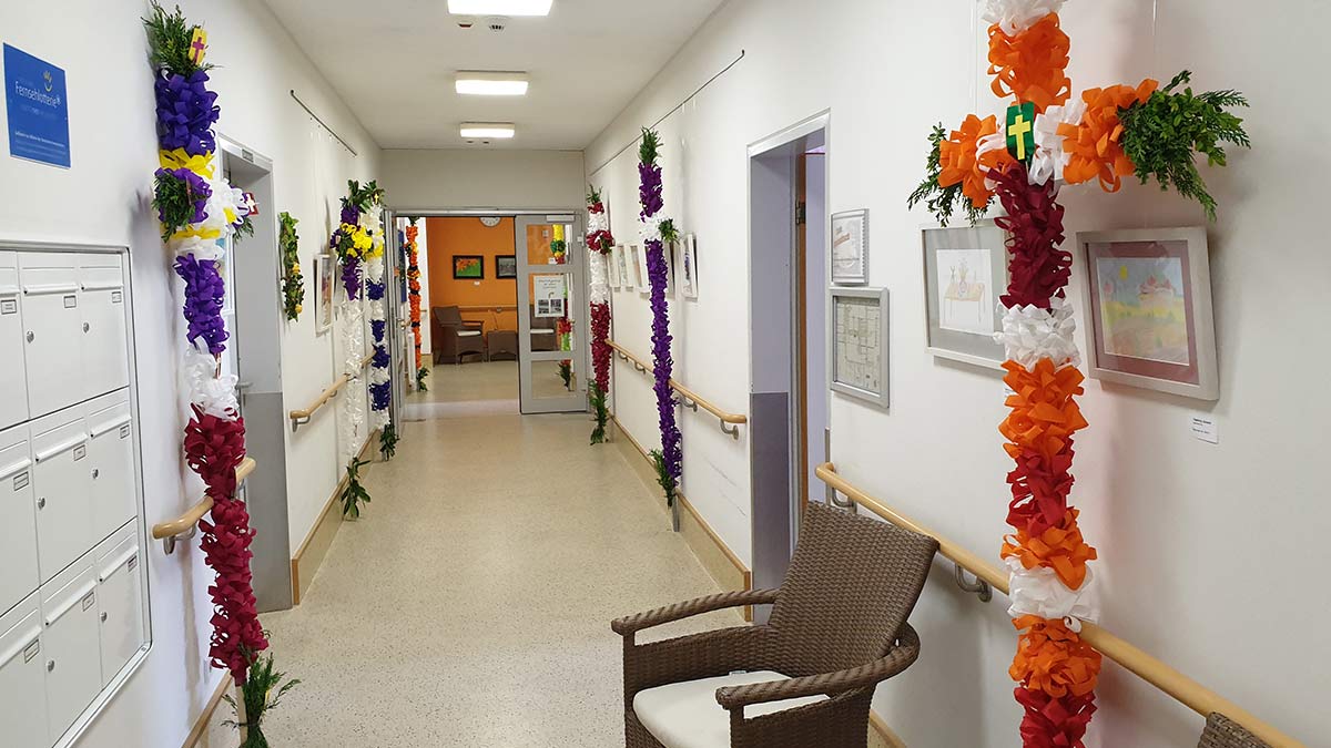 Die Bewohner*innen hatten viel Spaß bei den Bastelarbeiten und konnten ihre Fingerfertigkeit unter Beweis stellen. Die Palmen wurden im Erdgeschoss auf dem Weg in die Kapelle aufgestellt sowie in der Kapelle und erfreuten Gäste, Mitarbeiter*innen wie Bewohner*innen.